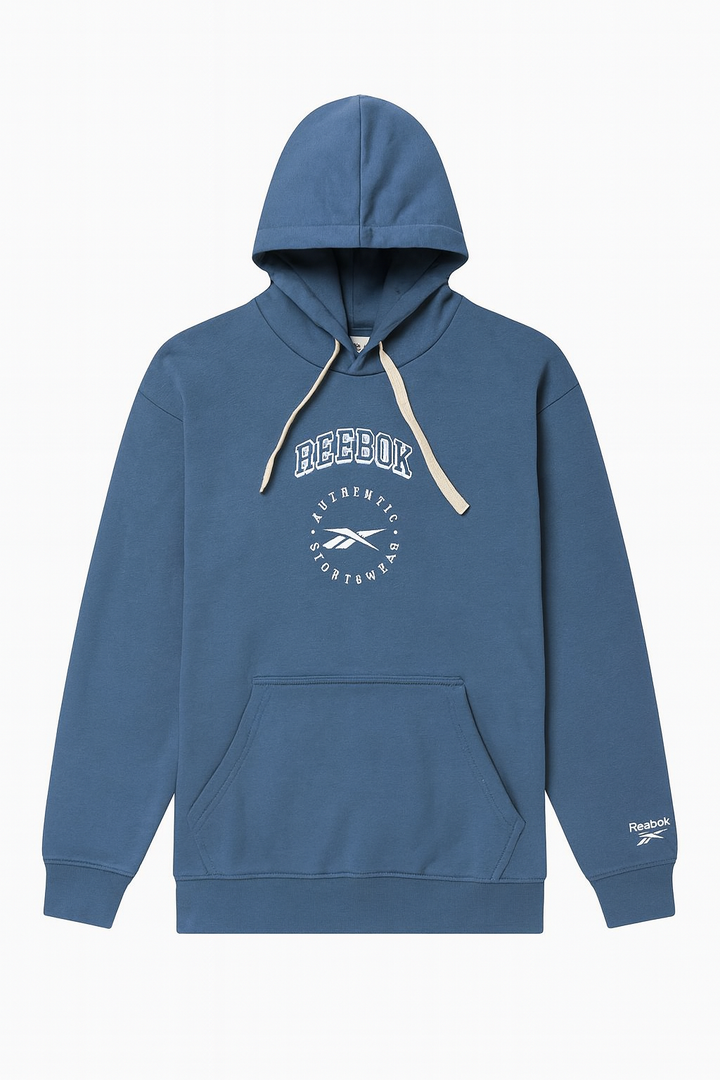 A stylish blue pullover hoodie with Reebok Authentic Sportswear print. Made from premium 330 GSM fabric, featuring an adjustable drawstring hood, kangaroo pocket, and ribbed cuffs for comfort and durability.