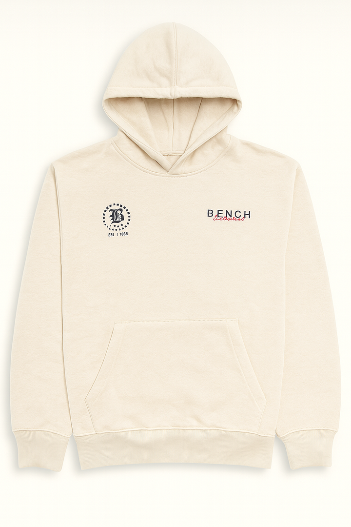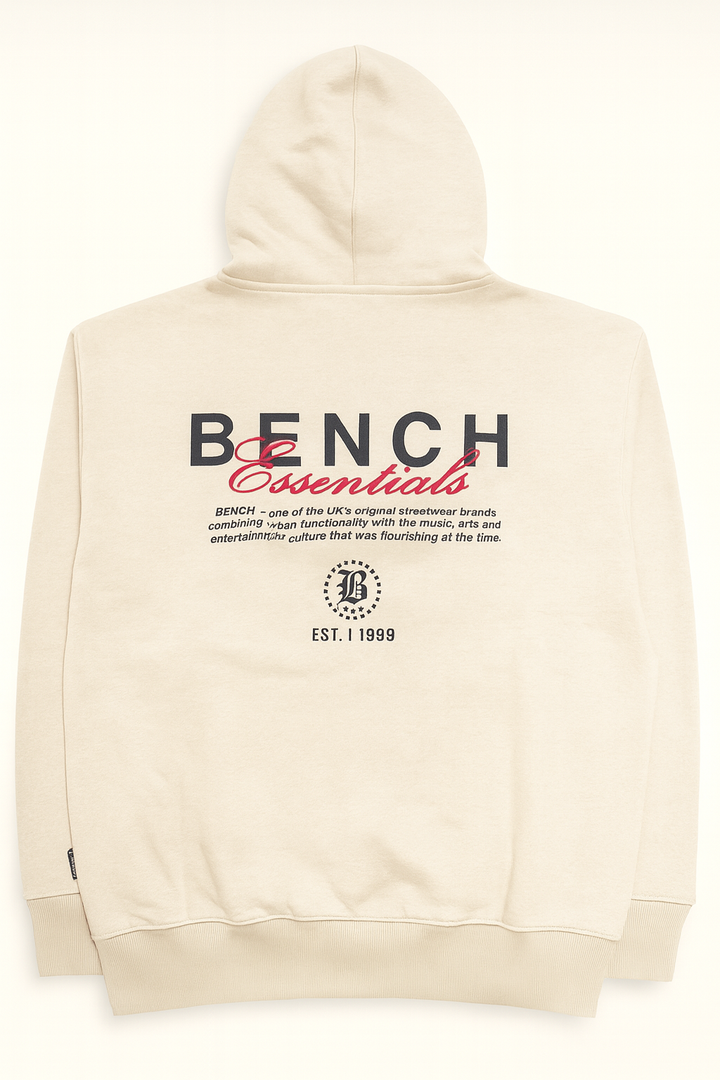 A premium beige hoodie featuring dual logo designs on the chest – “Bench Since 1989” branding with modern typography and graphic accents. Made from heavyweight 330 GSM cotton blend for durability and comfort, it includes ribbed cuffs, a kangaroo pocket, and an adjustable hood for a classic streetwear fit.