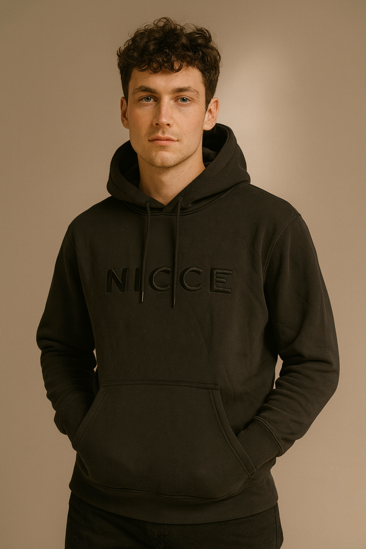 Minimalist black pullover hoodie featuring an embossed NICCE logo across the chest. Crafted from a soft cotton blend with drawstring hood and kangaroo pocket for a clean, modern streetwear look.