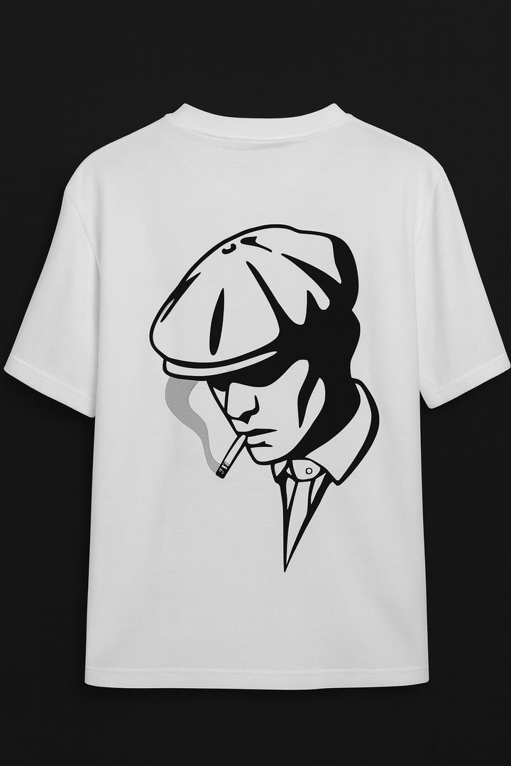 The graphic is positioned on the chest, and back. It depicts a stylized head and shoulders profile of a man wearing a flat cap (also known as a baker boy cap or newsboy cap) and a collared shirt with a tie.