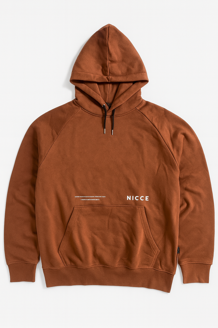 Brown-colored pullover hoodie with NICCE logo print on the front and bold graphic text on the back. Made from a soft cotton blend with drawstring hood and kangaroo pocket for a stylish streetwear edge.