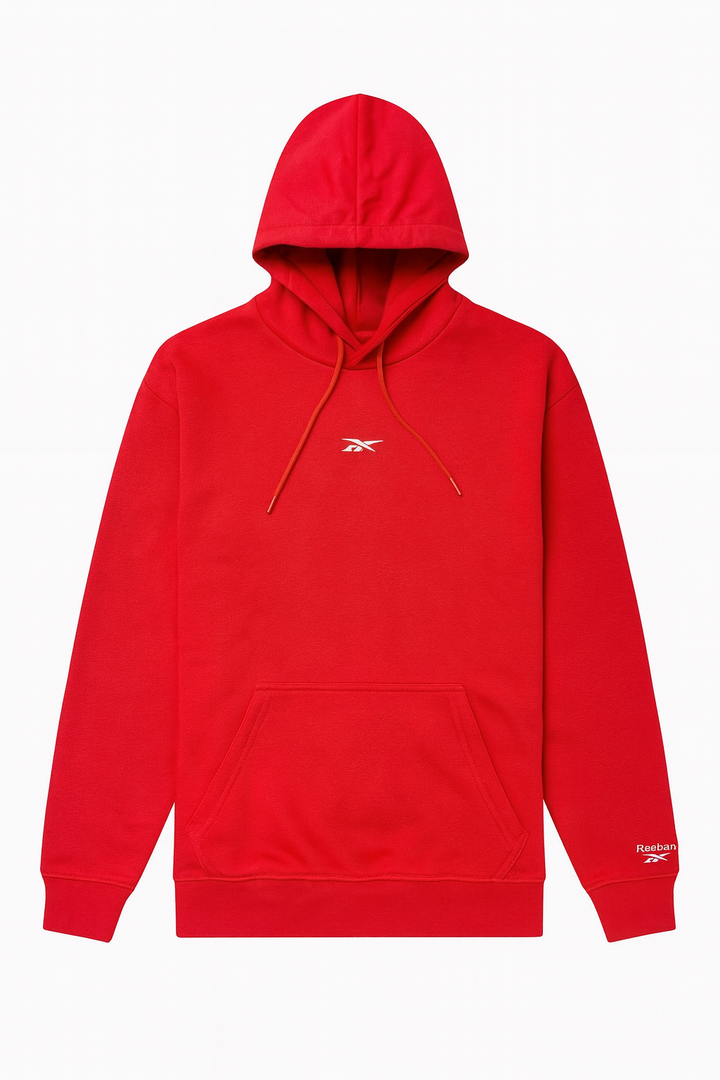 A clean and bold red pullover hoodie with subtle Reebok logo detail. Made from premium 330 GSM fabric, featuring an adjustable drawstring hood, kangaroo pocket, and ribbed cuffs for a perfect everyday fit.