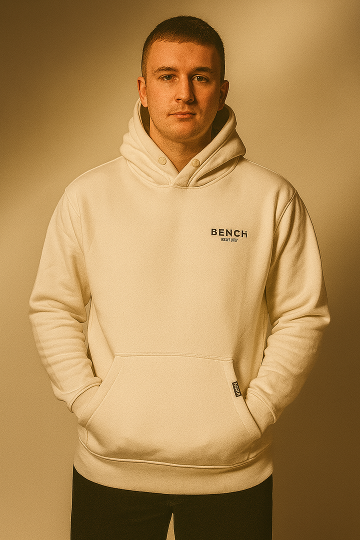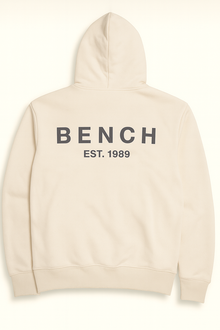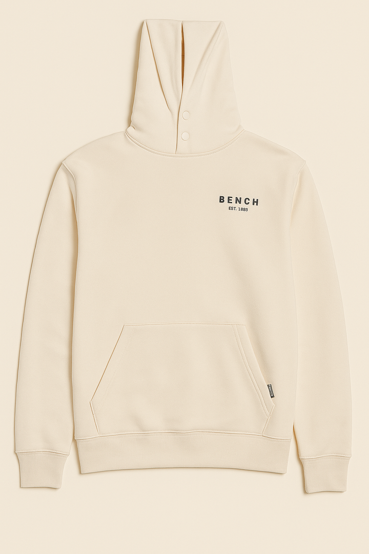 A modern cream-colored hoodie featuring a unique hoodie design with button detail for added warmth and style. Embellished with a minimal “Bench Est. 1989” logo on the chest and backside, it is crafted from premium 330 GSM cotton blend. Complete with a kangaroo pocket, ribbed cuffs, and hem for a structured yet comfortable streetwear fit.