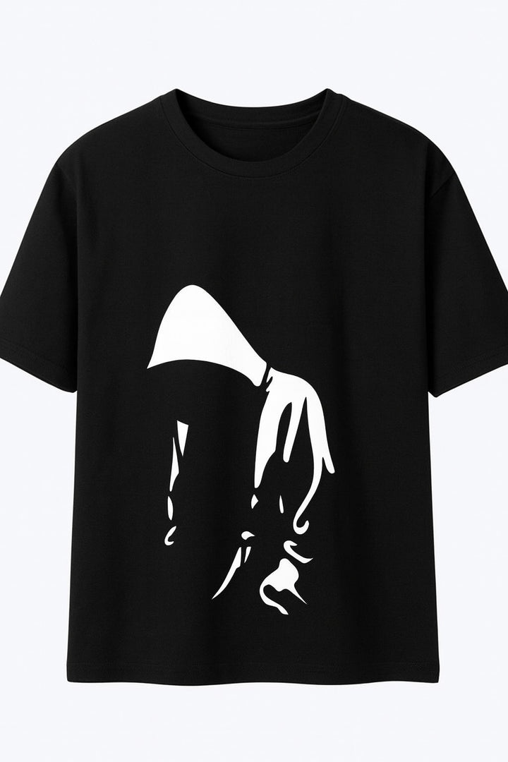 This is a black short-sleeved t-shirt featuring a striking white graphic silhouette of a figure in a hooded cloak or sweater.