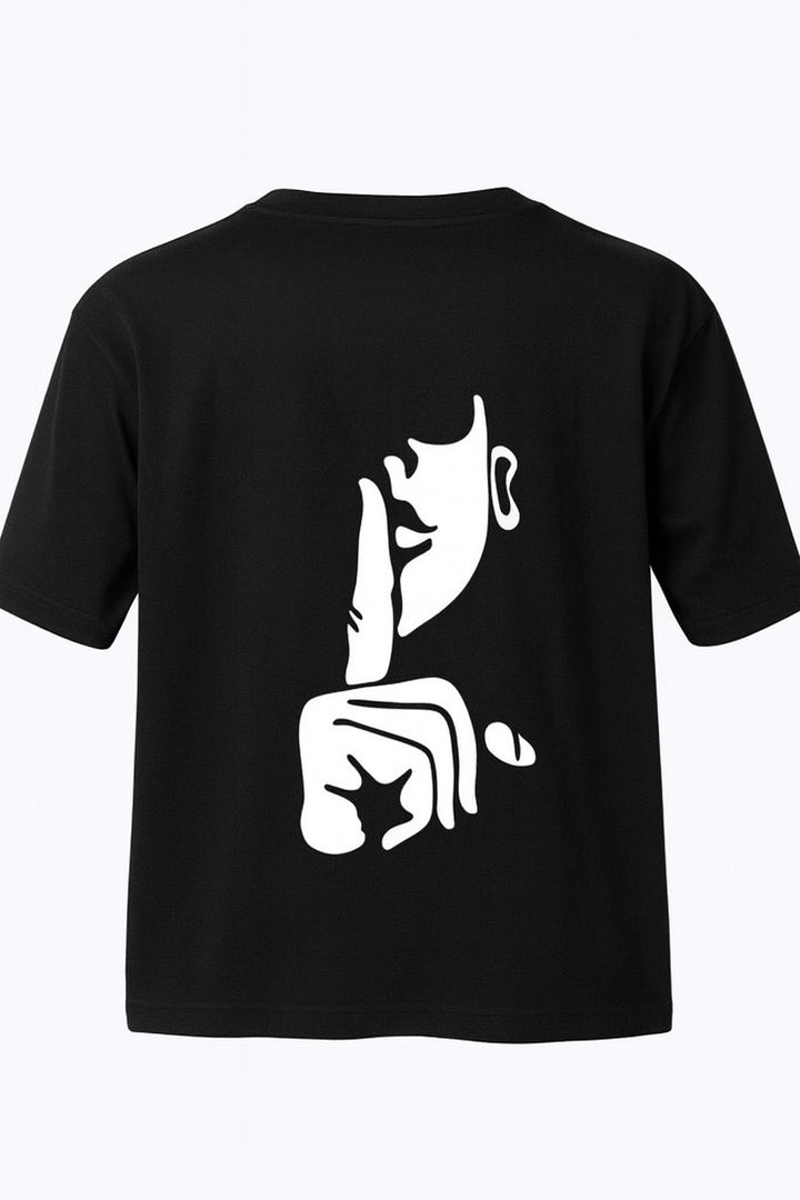 This is a black short-sleeved t-shirt featuring a striking white graphic of a figure performing the universal "quiet" gesture.