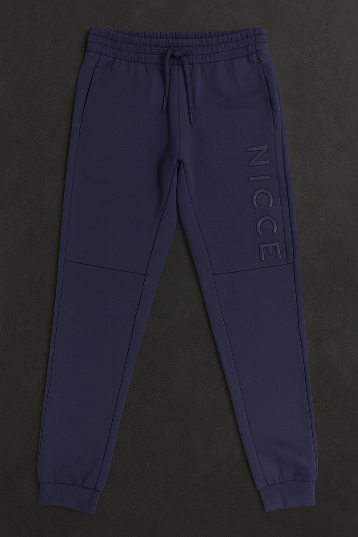 Navy blue joggers with embossed NICCE logo on the leg. Features an elasticated waistband with drawstring, side pockets, and cuffed ankles for a sleek and comfortable streetwear fit.