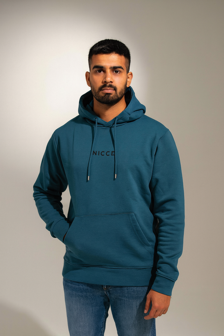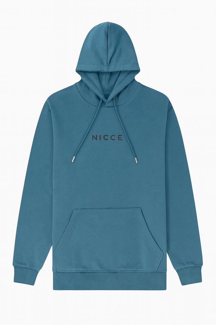 A stylish blue pullover hoodie with minimal NICCE logo detailing. Made from premium 330 GSM fabric, featuring an adjustable drawstring hood, kangaroo pocket, and ribbed cuffs for a clean everyday look.