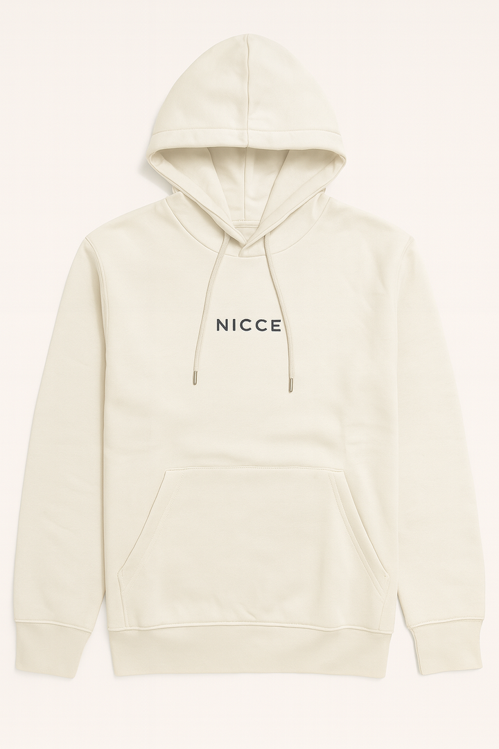 A sleek off-white pullover hoodie with the NICCE chest logo. Made from premium 330 GSM fabric, featuring an adjustable drawstring hood, kangaroo pocket, and ribbed cuffs for a clean everyday look.