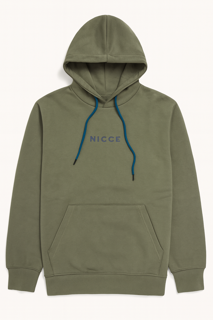 A stylish olive green pullover hoodie with the NICCE logo on the chest and contrasting blue drawstrings. Made from premium 330 GSM fabric, featuring an adjustable hood, kangaroo pocket, and ribbed cuffs for everyday comfort.