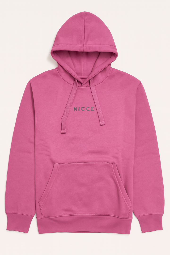 A bold pink pullover hoodie with the NICCE logo on the chest. Made from premium 330 GSM fabric, featuring an adjustable drawstring hood, kangaroo pocket, and ribbed cuffs for a stylish everyday fit.